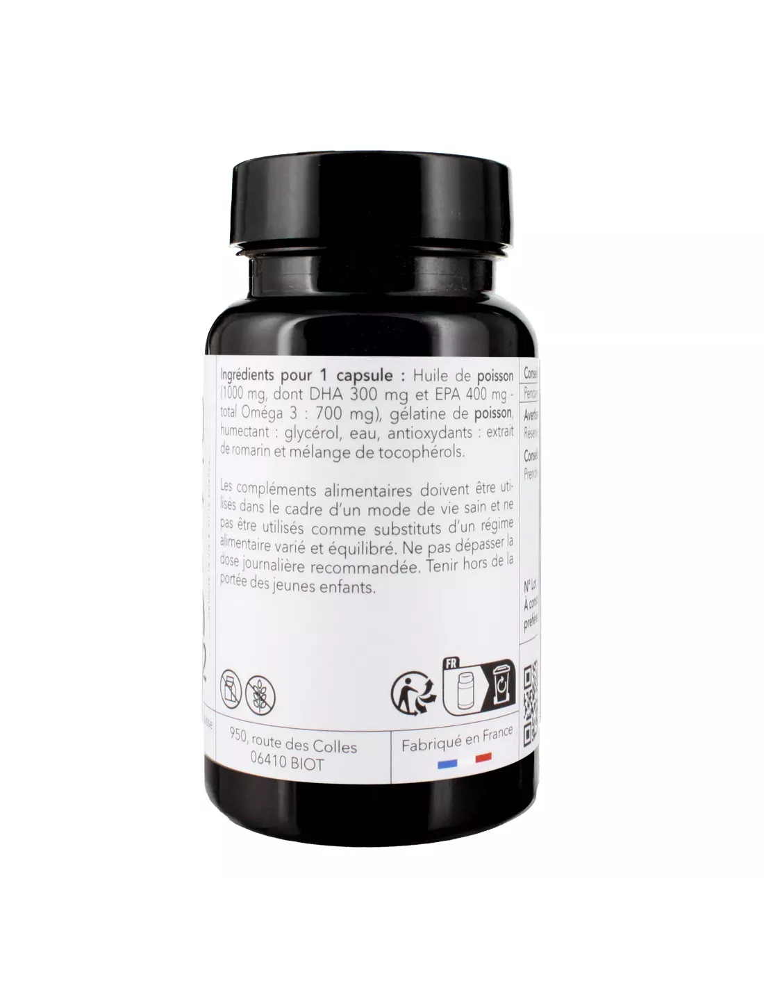 Ingrédients : huile de poisson, gélatine de poisson, glycérol, antioxydants : extrait de romarin et mélange de tocophérols. Peut contenir des traces de poisson.