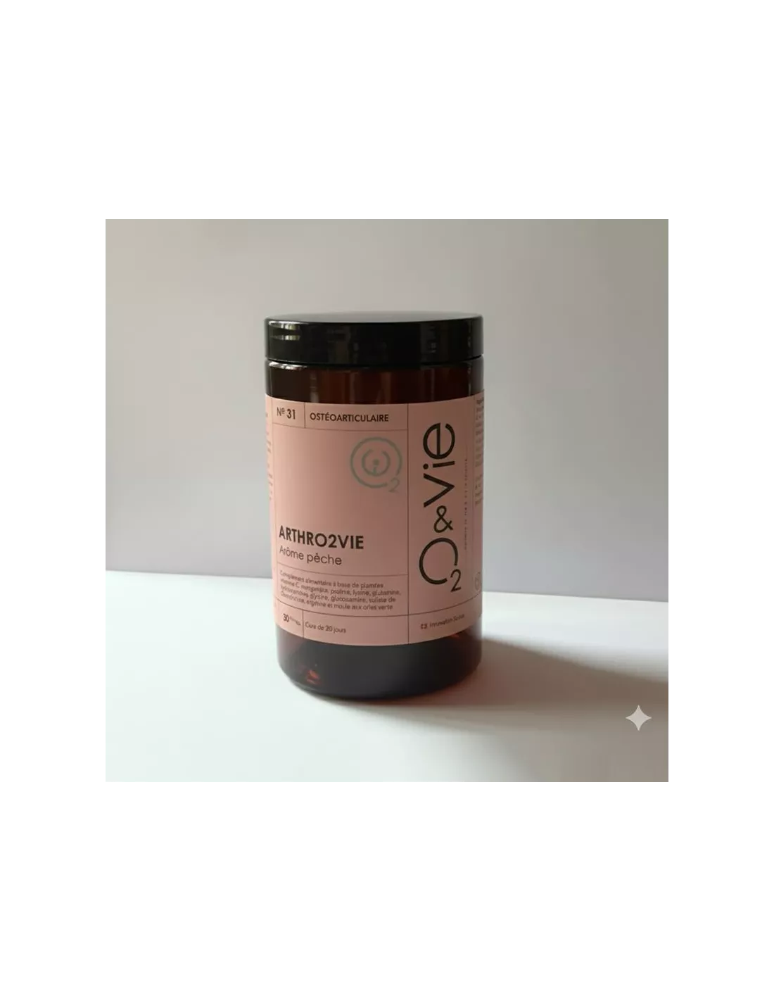 Ingrédients : Poudre d'exsudat de bambous (Bambusa arundinacea), sulfate de glucosamine KCl (crustacés), poudre de feuille d'ail des ours (Allium ursinum), glycine, chondroïtine sulfate sodique (poisson), l-proline, chlorhydrate de L-lysine, l-glutamine, l-proline, l-arginine, poudre de racine d'harpagophytum (Harpagophytum procumbens), moule aux orles verte (crustacés, poisson, mollusques), acide l-ascorbique (vitamine C.), arôme pêche, gluconate de manganèse.