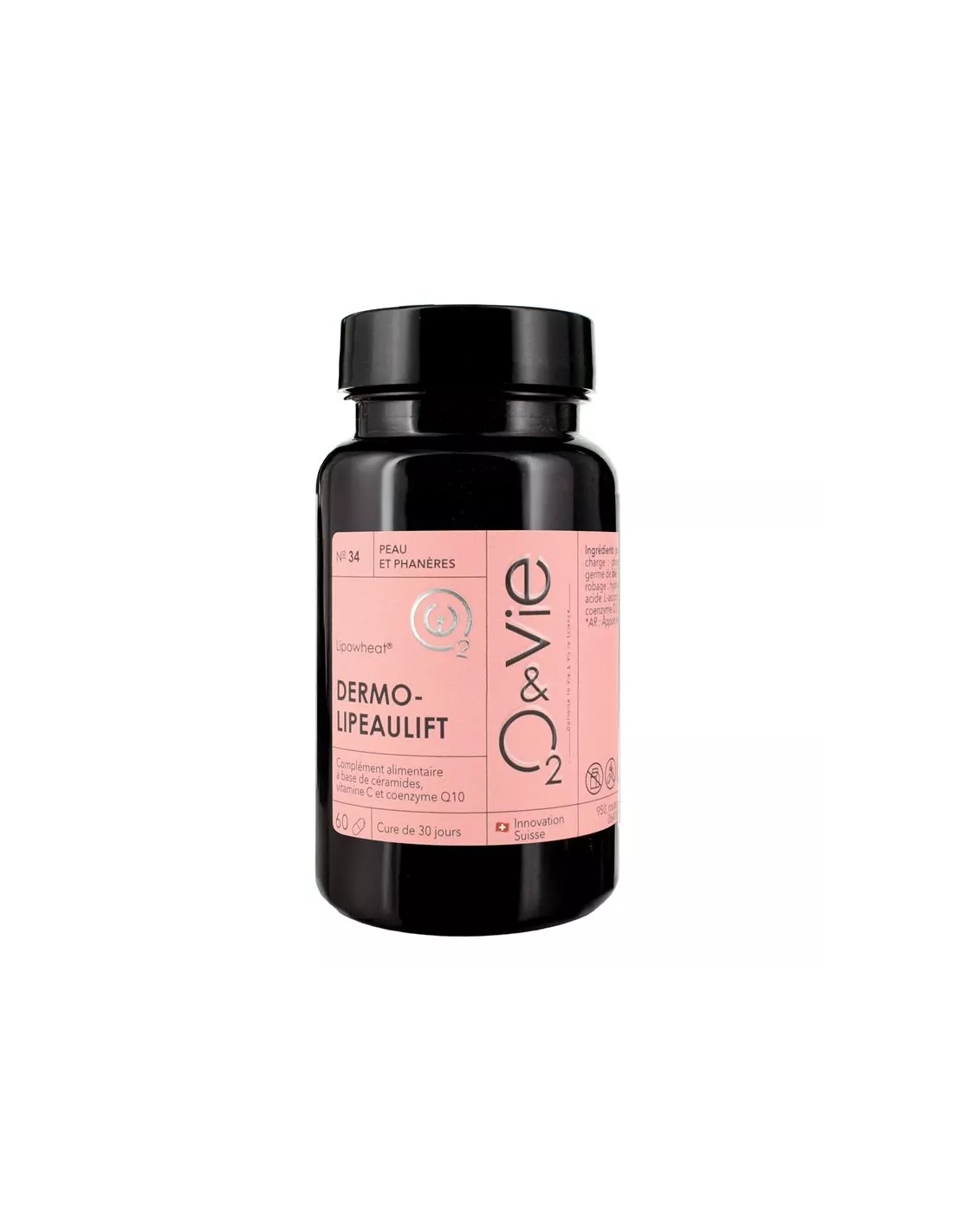 Ingrédients : Lipowheat™ (Agent de charge : phosphate dicalcique, extrait lipidique de germe de blé (Triticum aestivum), agent d'enrobage : hydroxypropylméthylcellulose, acide l-ascorbique (vitamine C.), coenzyme Q10.Peut contenir des traces de gluten.
