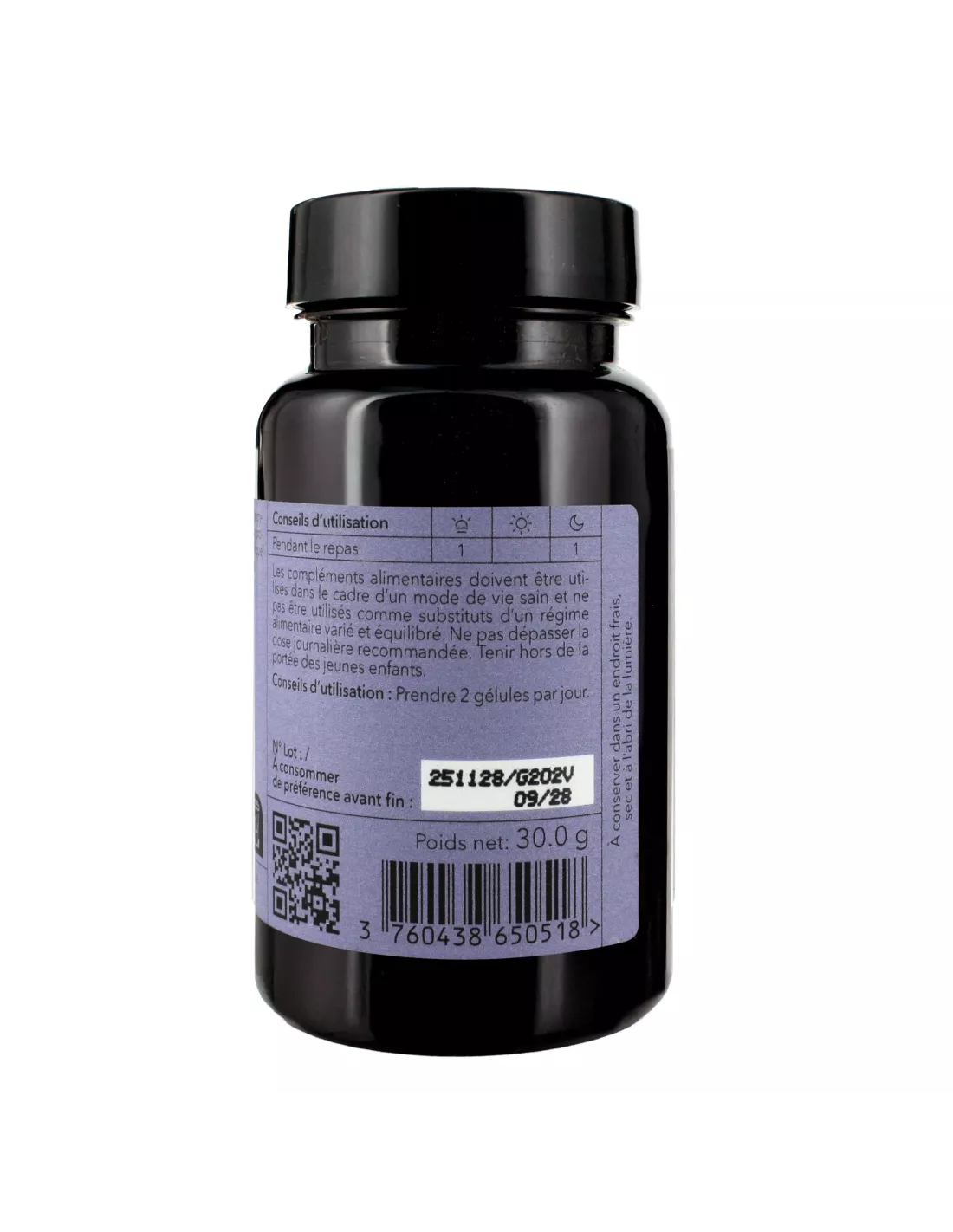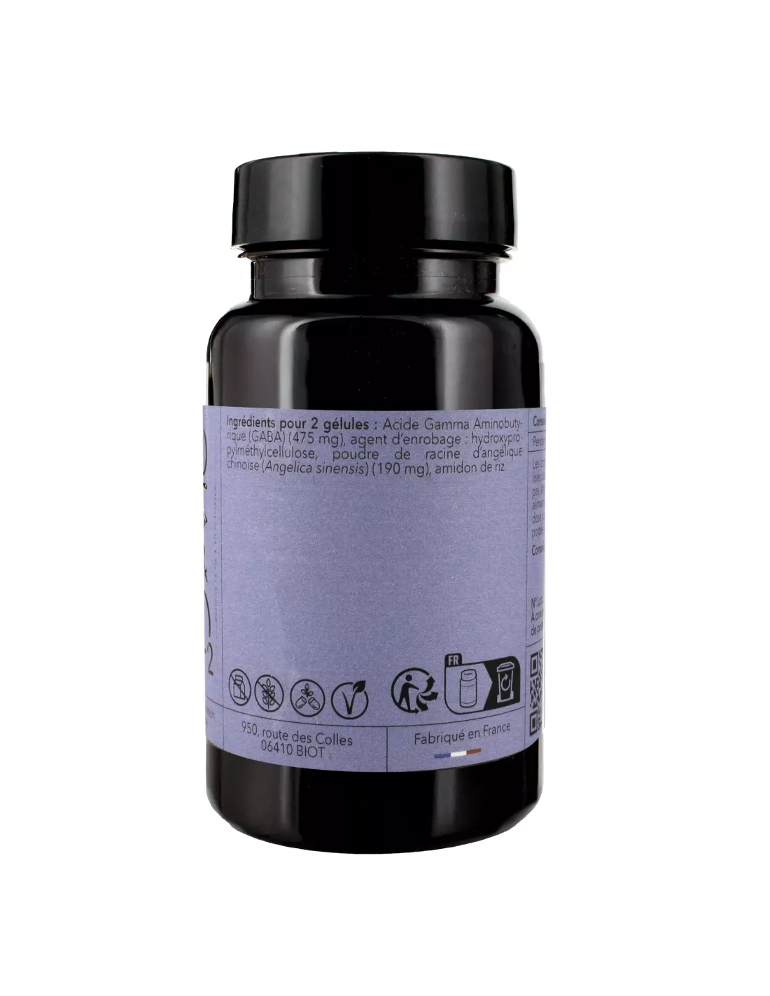 Ingrédients : Acide gamma-aminobutyrique (GABA), agent d’enrobage :hydroxypropylméthylcellulose, poudre de racine d’angélique chinoise (Angelica d’Angelica sinensis).