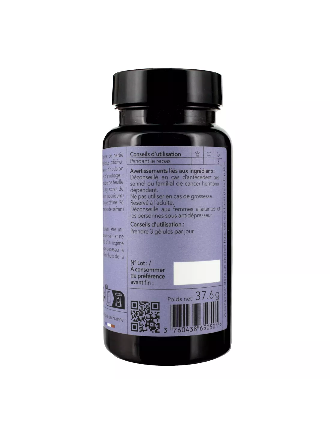 Ingrédients : Poudre de partie aérienne de mélilot officinal (Melilotus officinalis), poudre d’inflorescence d’houblon (Humulus lupulus), agent d’enrobage:hydroxypropylméthylcellulose, poudre de feuille de mélisse (Melissa officinalis), extrait de Sophora du Japon (Styph - nolobium japonicum) titré en quercétine, safr’lnsideTM (Extrait de stigmates de safran) ( Crocus sativus).