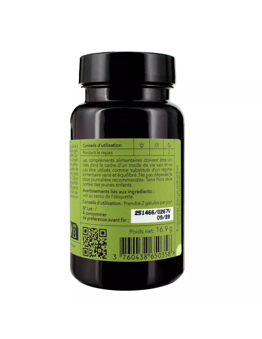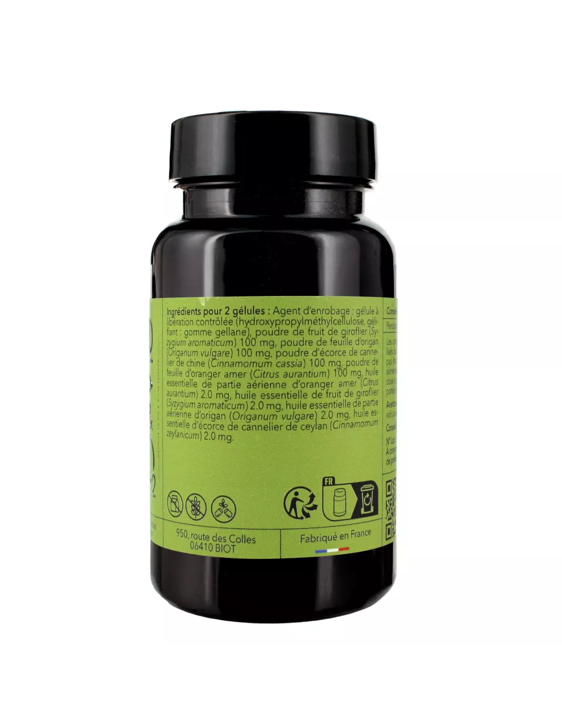 Ingrédients : Agent d’enrobage: gélule à libération contrôlée (hydroxypropylméthylcellulose, gélifiant: gomme gellane), poudre de fruit de giroflier ( Syzygium a romaticum), poudre de feuille d’origan ( Origanum vulgare), poudre d’écorce de cannelier de chine ( Cinnamomum cassia), poudre de feuille d’oranger amer ( Citrus aurantium), huile essentielle de partie aérienne d’oranger amer ( Citrus aurantium), huile essentielle de fruit de giroflier ( Syzygium aroma ticum), huile essentielle de partie aérienne d’origan ( Origanum vulgare), huile essentielle d’écorce de cannelier de chine ( Cinnamomum cassia). Digestion - Intestin - Microbiotes - Biofilms 60