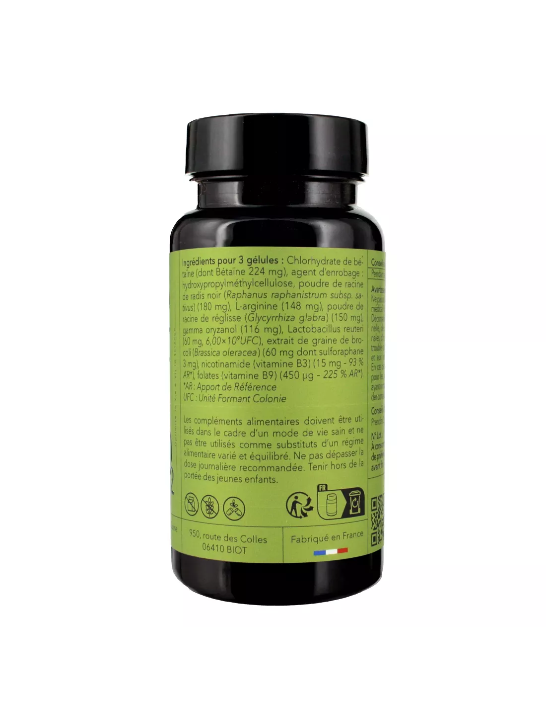 Ingrédients : Chlorhydrate de betaïne, agent d'enrobage : hydroxypropylméthylcellulose, poudre de racine de radis noir (Raphanus raphanistrum subsp. sativus), l-arginine, poudre de racine de réglisse (Glycyrrhiza glabra), gamma oryzanol, Lactobacilus reuteri, extrait de graine de broccoli (Brassica oleracea) titré en sulforaphane, nicotinamide (vitamine B3), acide ptéroylglutamique (vitamine B9).