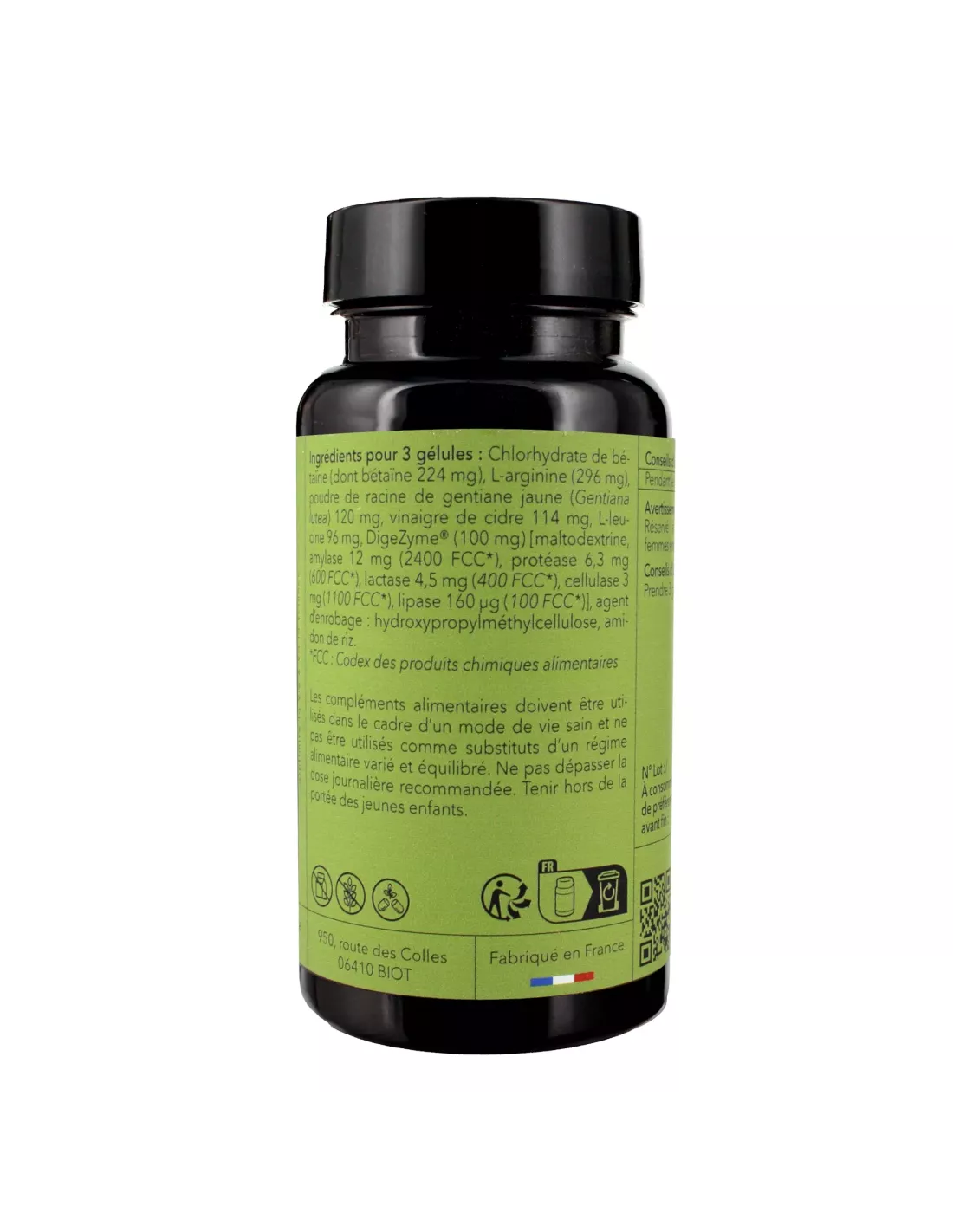 Ingrédients : Chlorhydrate de betaïne, l-arginine, vinaigre de cidre, agent d'enrobage : hydroxypropylméthylcellulose, poudre de racine de gentiane jaune (Gentiana lutea), DigeZyme® (maltodextrine, amylase, protéase, bêta-cellulase, lipase).