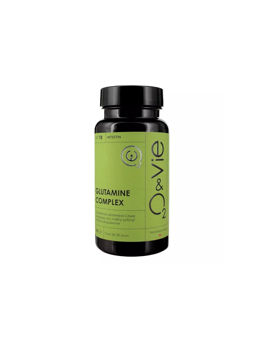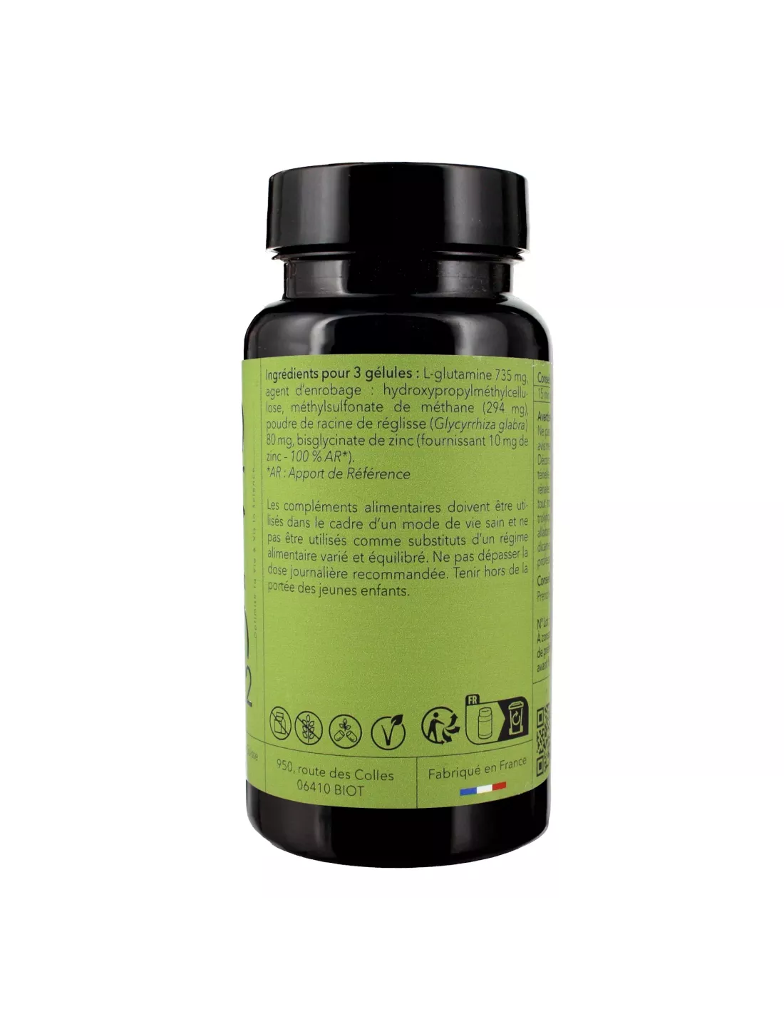 Ingrédients : L-glutamine, agent d'enrobage : hydroxypropylméthylcellulose, méthyl sulfonyl méthane, poudre de racine de réglisse (Glycyrrhiza glabra), bisglycinate de zinc.