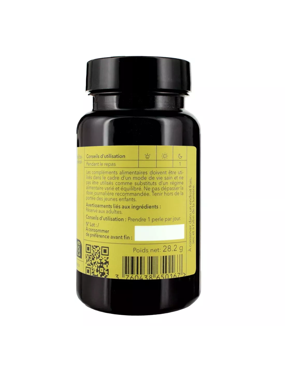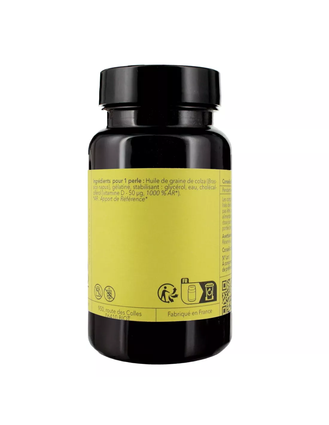 Ingrédients : huile de colza (Brassica napus L), capsule (gélatine, glycérol et eau), vitamine D3 (cholécalciférol).