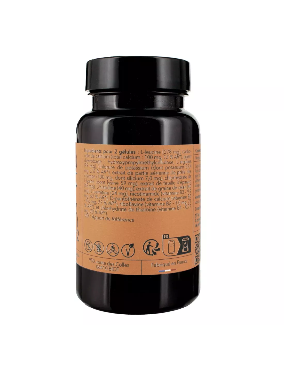 Ingrédients : Carbonate de calcium, agent d'enrobage: hydroxypropylméthylcellulose, l-arginine, chlorure de potassium, extrait de partie aérienne de prêle des champs (Equisetum arvense) dosé en silicium, extrait de feuille d'épinard (Spinacia oleracea), hydrochlorure de l-lysine, extrait de graine de céleri (Apium graveolens), l-carnitine, chlorhydrate de l-histidine, nicotinamide (vitamine B3), d-pantothénate de calcium, riboflavine (vitamine B2), chlorhydrate de thiamine (vitamine B1).Peut contenir du céleri.